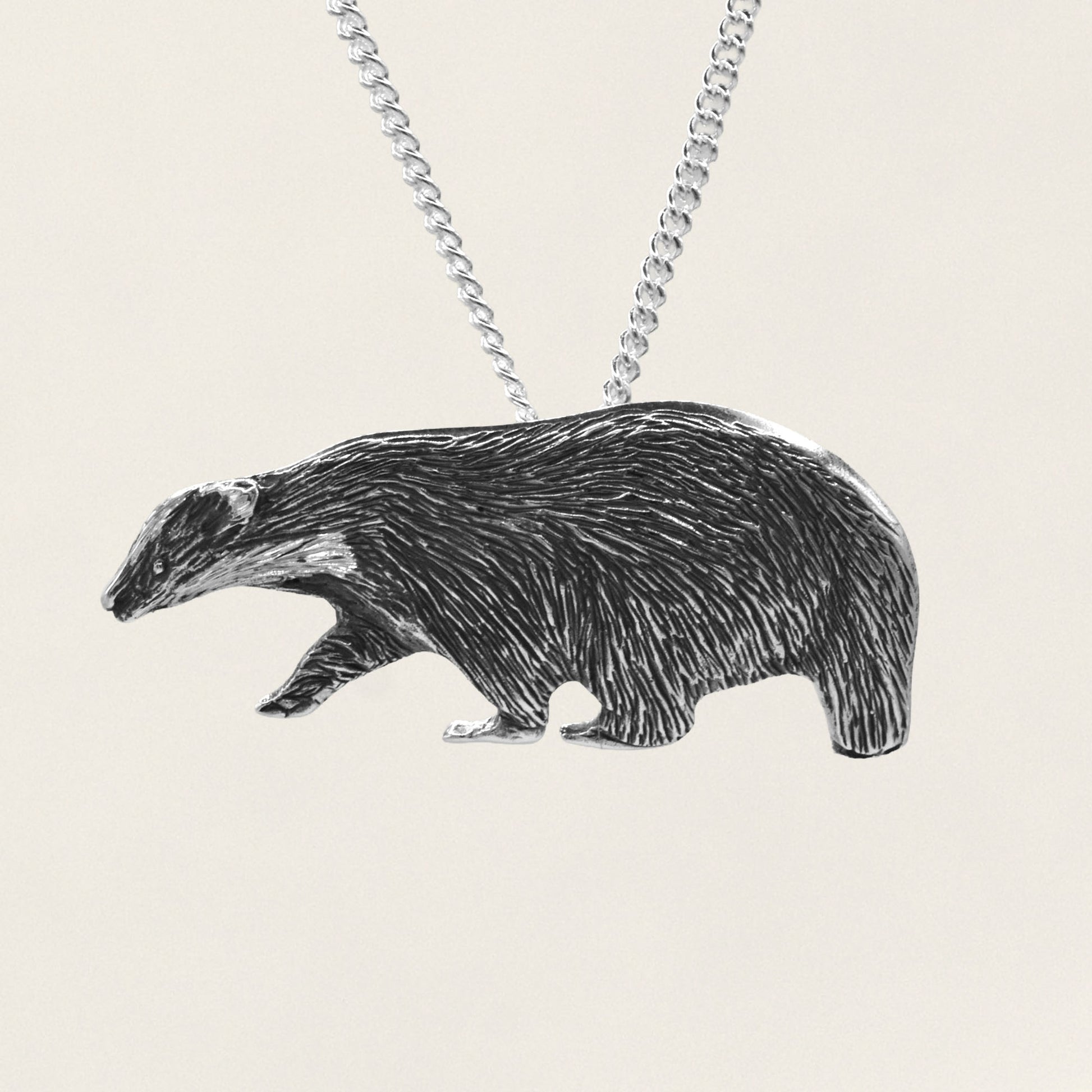 Take a step into nature with this lifelike badger pendant. The silver pendant is adorned with details making the little badger come to life. The engraved fur pattern, her little beady eye and, of course, the badgers iconic white stripe down her nose, this piece is created with patination techniques such as oxidising, polishing and engraving.